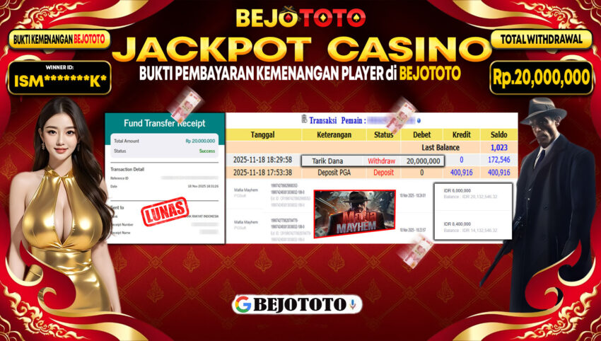 BEJOTOTO– Selamat kepada User id : ISM*******K* Telah berhasil mendapatkan kemenangan besar pada permainan SLOT MAFIA MAYHEM Dengan kemenangan Sebesar Rp.20,000,000-. Setelah mengisi formulir withdraw dengan kurung waktu hanya 5 – 10 menit pihak BEJOTOTO sudah melakukan transfer kepada pemilik Userid dan dana sudah dapat di cairkan oleh pemenang. Bukti pembayaran yang kami berikan merupakan bukti pembayaran yang SAH / VALID yang langung di dapatkan melaui tanda transfer transaksi dari Bank yang di tuju.