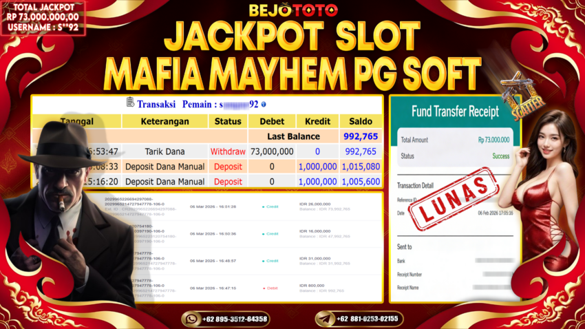 BEJOTOTO– Selamat kepada User id : S**92 Telah berhasil mendapatkan kemenangan besar pada permainan SLOT MAFIA MAYHEM Dengan kemenangan Sebesar Rp.73,000,000-. Setelah mengisi formulir withdraw dengan kurung waktu hanya 5 – 10 menit pihak BEJOTOTO sudah melakukan transfer kepada pemilik Userid dan dana sudah dapat di cairkan oleh pemenang. Bukti pembayaran yang kami berikan merupakan bukti pembayaran yang SAH / VALID yang langung di dapatkan melaui tanda transfer transaksi dari Bank yang di tuju.