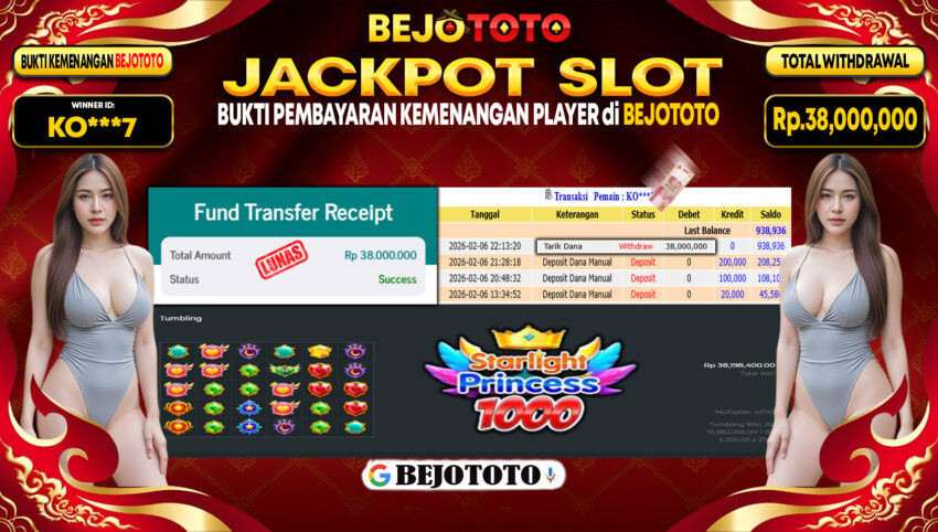 BEJOTOTO – Selamat kepada User id : KO***7 Telah berhasil mendapatkan kemenangan besar pada permainan  SLOT PRAGMATIC PRAGMATIC STARLIGHT PRINCESS 1000 Dengan kemenangan Sebesar Rp.38,000,000,-. Setelah mengisi formulir withdraw dengan kurung waktu hanya 5 – 10 menit pihak BEJOTOTO sudah melakukan transfer kepada pemilik Userid dan dana sudah dapat di cairkan oleh pemenang. Bukti pembayaran yang kami berikan merupakan bukti pembayaran yang SAH / VALID yang langung di dapatkan melaui tanda transfer transaksi dari Bank yang di tuju.