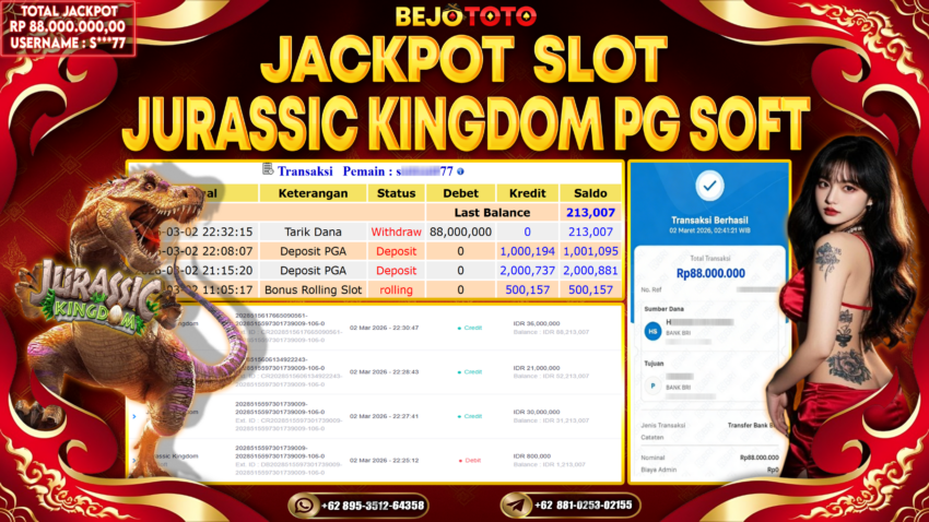 BEJOTOTO – Selamat kepada User id : S***77 Telah berhasil mendapatkan kemenangan besar pada permainan SLOT PG JURASSIC KINGDOM Dengan kemenangan Sebesar Rp.88,000,000-. Setelah mengisi formulir withdraw dengan kurung waktu hanya 5 – 10 menit pihak BEJOTOTO sudah melakukan transfer kepada pemilik Userid dan dana sudah dapat di cairkan oleh pemenang. Bukti pembayaran yang kami berikan merupakan bukti pembayaran yang SAH / VALID yang langung di dapatkan melaui tanda transfer transaksi dari Bank yang di tuju.