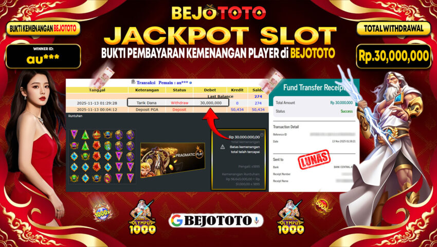 BEJOTOTO – Selamat kepada User id : au*** Telah berhasil mendapatkan kemenangan besar pada permainan SLOT PRAGMATIC GATES OF OLYMPUS 1000 Dengan kemenangan Sebesar Rp.30,000,000,-. Setelah mengisi formulir withdraw dengan kurung waktu hanya 5 – 10 menit pihak BEJOTOTO sudah melakukan transfer kepada pemilik Userid dan dana sudah dapat di cairkan oleh pemenang. Bukti pembayaran yang kami berikan merupakan bukti pembayaran yang SAH / VALID yang langung di dapatkan melaui tanda transfer transaksi dari Bank yang di tuju.