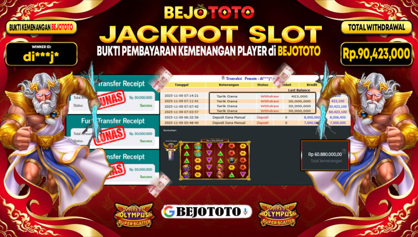 BEJOTOTO – Selamat kepada User id : di***j* Telah berhasil mendapatkan kemenangan besar pada permainan  SLOT PRAGMATIC GATES OF OLYMPUS SUPER SCATTER  Dengan kemenangan Sebesar Rp.90,423,000,-. Setelah mengisi formulir withdraw dengan kurung waktu hanya 5 – 10 menit pihak BEJOTOTO sudah melakukan transfer kepada pemilik Userid dan dana sudah dapat di cairkan oleh pemenang. Bukti pembayaran yang kami berikan merupakan bukti pembayaran yang SAH / VALID yang langung di dapatkan melaui tanda transfer transaksi dari Bank yang di tuju.