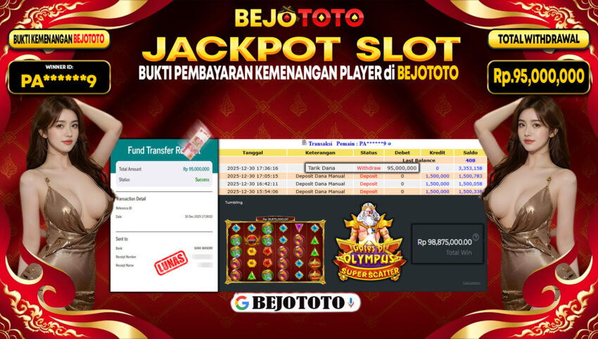 BEJOTOTO – Selamat kepada User id : PA******9 Telah berhasil mendapatkan kemenangan besar pada permainan  SLOT PRAGMATIC GATES OF OLYMPUS SUPER SCATTER  Dengan kemenangan Sebesar Rp.95,000,000,-. Setelah mengisi formulir withdraw dengan kurung waktu hanya 5 – 10 menit pihak BEJOTOTO sudah melakukan transfer kepada pemilik Userid dan dana sudah dapat di cairkan oleh pemenang. Bukti pembayaran yang kami berikan merupakan bukti pembayaran yang SAH / VALID yang langung di dapatkan melaui tanda transfer transaksi dari Bank yang di tuju.