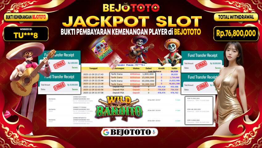 BEJOTOTO – Selamat kepada User id : TU***8 Telah berhasil mendapatkan kemenangan besar pada permainan  SLOT WILD BANDITO  Dengan kemenangan Sebesar Rp.76,800,000-. Setelah mengisi formulir withdraw dengan kurung waktu hanya 5 – 10 menit pihak BEJOTOTO sudah melakukan transfer kepada pemilik Userid dan dana sudah dapat di cairkan oleh pemenang. Bukti pembayaran yang kami berikan merupakan bukti pembayaran yang SAH / VALID yang langung di dapatkan melaui tanda transfer transaksi dari Bank yang di tuju.