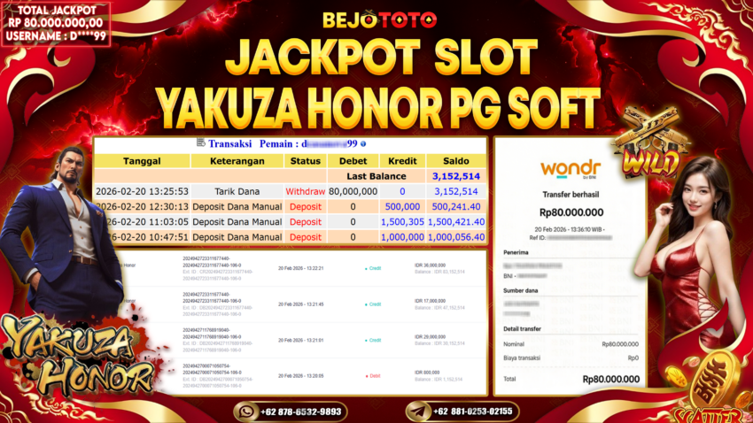 BEJOTOTO – Selamat kepada User id : D****99 Telah berhasil mendapatkan kemenangan besar pada permainan SLOT YAKUZA HONOR Dengan kemenangan Sebesar Rp.80,000,000-. Setelah mengisi formulir withdraw dengan kurung waktu hanya 5 – 10 menit pihak BEJOTOTO sudah melakukan transfer kepada pemilik Userid dan dana sudah dapat di cairkan oleh pemenang. Bukti pembayaran yang kami berikan merupakan bukti pembayaran yang SAH / VALID yang langung di dapatkan melaui tanda transfer transaksi dari Bank yang di tuju.