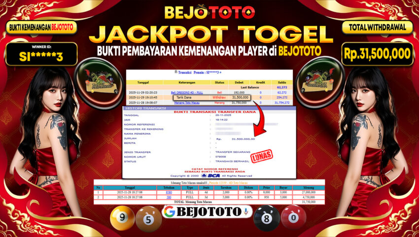 BEJOTOTO – Selamat kepada User id : SI*****3 Telah berhasil mendapatkan kemenangan besar pada permainan TOGEL TOTOMACAU 4D Dengan kemenangan Sebesar Rp.31,500,000,-. Setelah mengisi formulir withdraw dengan kurung waktu hanya 5 – 10 menit pihak BEJOTOTO sudah melakukan transfer kepada pemilik Userid dan dana sudah dapat di cairkan oleh pemenang. Bukti pembayaran yang kami berikan merupakan bukti pembayaran yang SAH / VALID yang langung di dapatkan melaui tanda transfer transaksi dari Bank yang di tuju.
