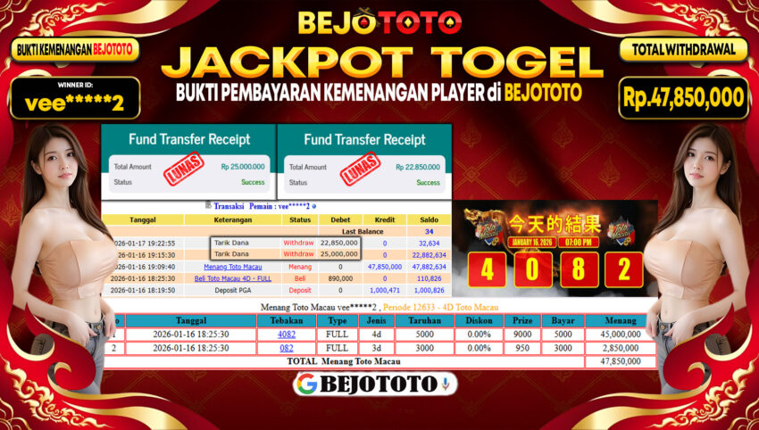 BEJOTOTO – Selamat kepada User id : vee*****2 Telah berhasil mendapatkan kemenangan besar pada permainan TOGEL TOTOMACAU 4D Dengan kemenangan Sebesar Rp.47,850,000,-. Setelah mengisi formulir withdraw dengan kurung waktu hanya 5 – 10 menit pihak BEJOTOTO sudah melakukan transfer kepada pemilik Userid dan dana sudah dapat di cairkan oleh pemenang. Bukti pembayaran yang kami berikan merupakan bukti pembayaran yang SAH / VALID yang langung di dapatkan melaui tanda transfer transaksi dari Bank yang di tuju.